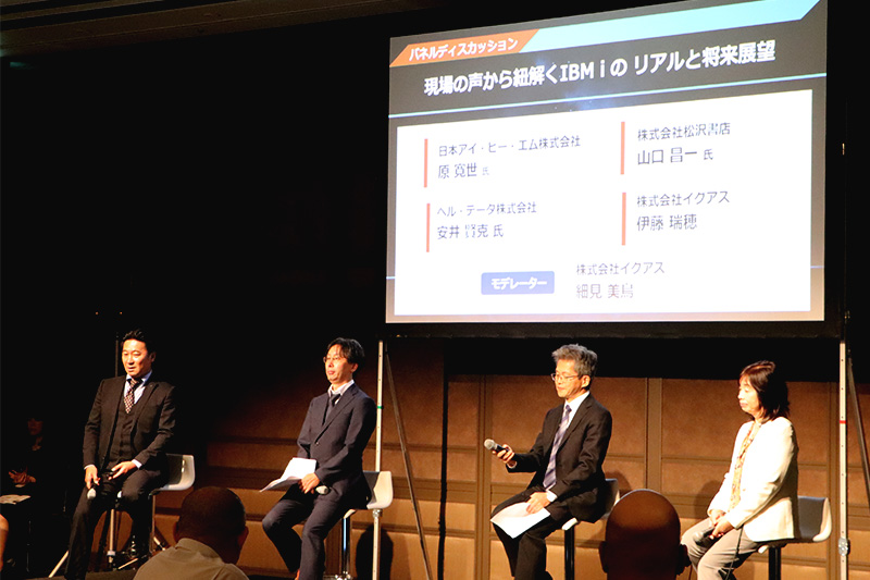 最初のセッションはパネル形式で行われ、パネラーとして日本アイ・ビー・エム株式会社の原寛世氏、株式会社松沢書店の山口昌一氏、ベル・データ株式会社の安井賢克氏、株式会社イグアスの伊藤瑞穂氏が登壇し、今後のIBM Power及びIBM iの将来性に関わる以下のテーマについて、次のような意見が展開されました。