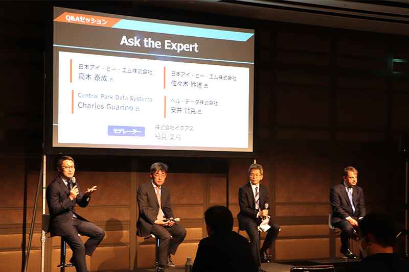 最後のセッションは、Web登録メンバーから事前に募集した質問にエキスパートが答える形で進行し、以下のようなQ&Aが行われました。(回答者は、日本アイ・ビー・エム株式会社の高木泰成氏および佐々木幹雄氏、ベル・データ株式会社の安井賢克氏、Central Park Data Systems社のチャールズ・グアリーノ氏です。以下、敬称を略します。)