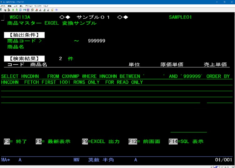 ①商品コード範囲検索 通常の範囲検索です。入力された値からSQLのWHERE句にBETWEENで条件を生成します。