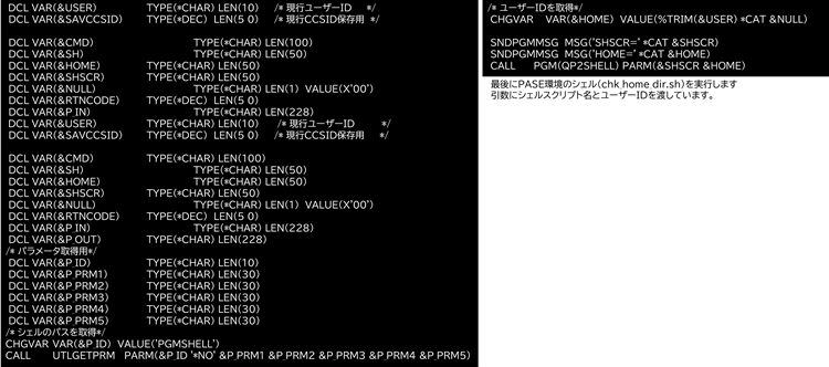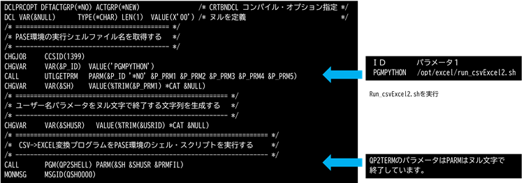 PASE環境を操作する場合は、実行しているJOBのCCSIDを5035か1399にする必要があります。サンプルではILECLPでCHGJOB CCSID(1399)を実行しています。英小文字は前述したようにSEUで入力するとケアレスミスが多い為、パラメータファイルに値をセットしたものを取得し使用するようにしています。(※この手法を採用してからは、英小文字の問題で悩まされる事はなくなりました。)