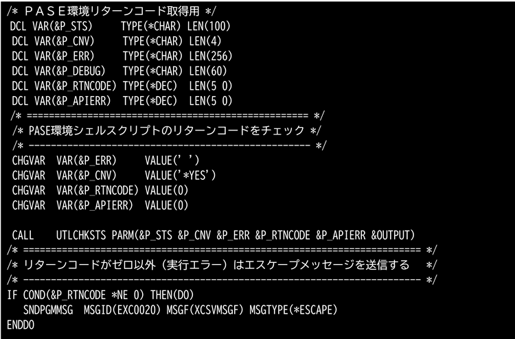 下記の例では、&P_RTNCODEにセットし後続のCLで成・否の判定をしています。