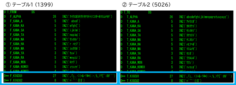 CCSID=1399では①テーブル1(5035)が正常に表示されます。②テーブル2(5026)が文字化けします。