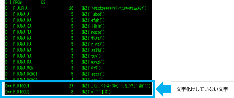 5035のテーブルは5026環境では別の文字が表示されます。幸いなことに、5035の英小文字及びカタカナは5026環境でも文字がマップされています。このため、16進表記を使用せずにSEUで表示できます。