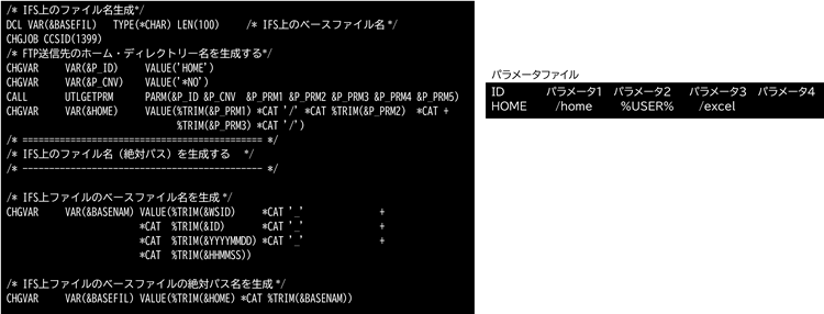 PASE環境は、AIX(UNIX)互換環境です。基本的にディレクトリー名・ファイル名に英小文字を使用します。また、環境によりディレクトリー階層が異なる事もあります。サンプルでは、ディレクトリー階層が変更されても対応できるように、パラメータファイルからディレクトリー階層を組み立てる様にしています。下記のILECLPでは、3階層までを想定しています。PRM4が未使用ですので、最大4階層まで対応できます。