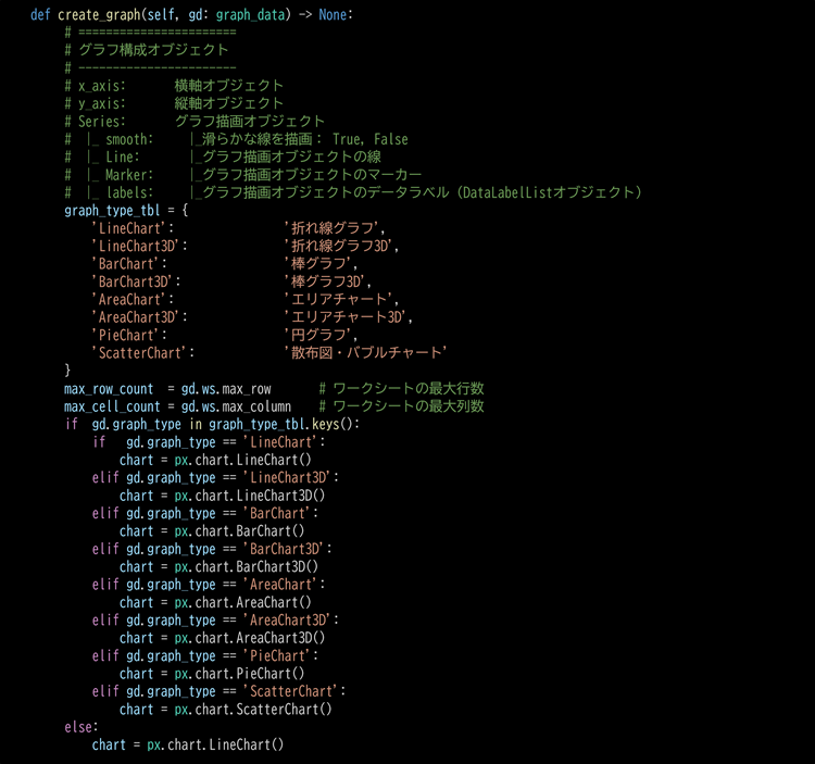 下記は定数定義の抜粋です。このようにしておくと、def_graph[csvExcelConst.GRAPH_TYPE]と記述できるため、入力ミスをしても開発ツールがアシストしてくれます。