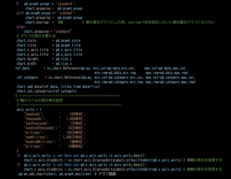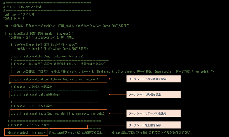| 14 | set_excel_cell_width | 指定したシートのセルの列幅を設定する(見やすくするため) VB.NETでは列単位に一括設定できるのですが、残念ながらopenpyxlはセル単位になります。この為、全セルに対して列幅を設定しています。 |