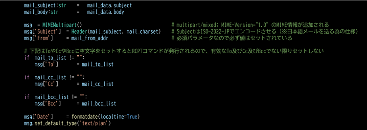 csvExcelUtil.pyでは、電子メールを送信するためのデータ構造体クラスも定義(宣言)しています。下記にその一部コードを記載します。