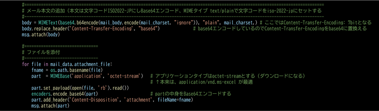 なお、添付ファイル名は、パートのヘッダー:Content-Dispotionのattachment属性にセットします。日本語ファイル名を使用する場合はエンコードが必須です。