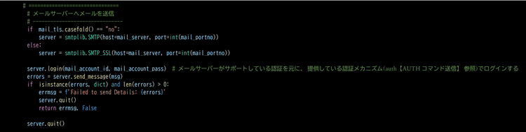 認証方法は複数あり、Pythonのメール関数では適切な認証を自動的に判断し使用します。ログイン後、send_messageで送信します。