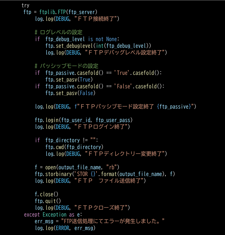 ftpは、「サーバー接続」、「ディレクトリー変更」、「バイナリーファイル送信」、「切断」のステップで行います。なお、Pythonのftpライブラリーは、日本語名を使用すると文字化けしてエラーとなります。ライブラリー名称は英大文字にするほうが無難です。