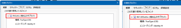 ※Apache-FOPでは生成されたPDFファイルにフォントが埋め込まれます。生成したPDFファイルのプロパティを表示すると、埋め込まれたフォントが確認できます。