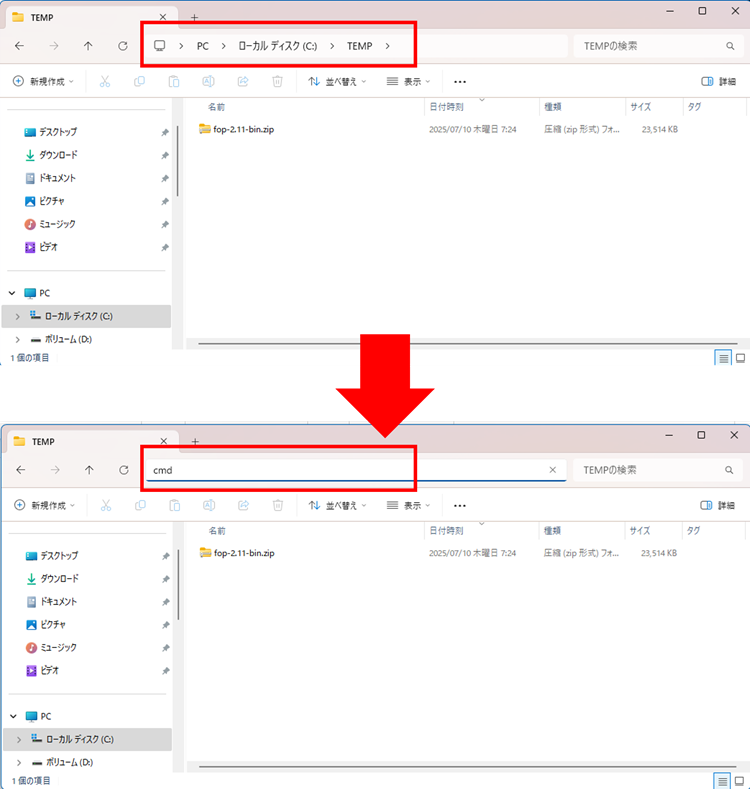 dirコマンドでダウンロードしたFOP-2.11-bin.zipが存在する事を確認します。
