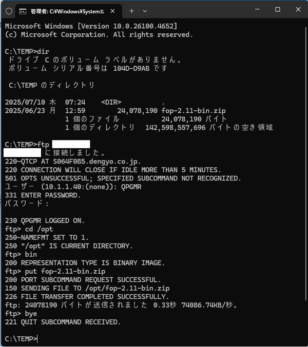 ftpコマンドでIBMiに接続し、/optにFOP-2.11-bin.zipをバイナリーモードでputします。(※詳細は下図を参照して下さい。)