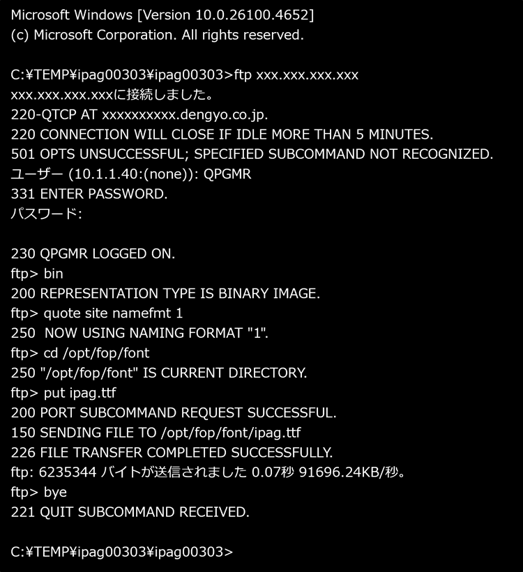 下記の様にftpでIPAゴシックフォント・ファイルをPASE環境の/opt/fop/fontにバイナリーモードで転送します。