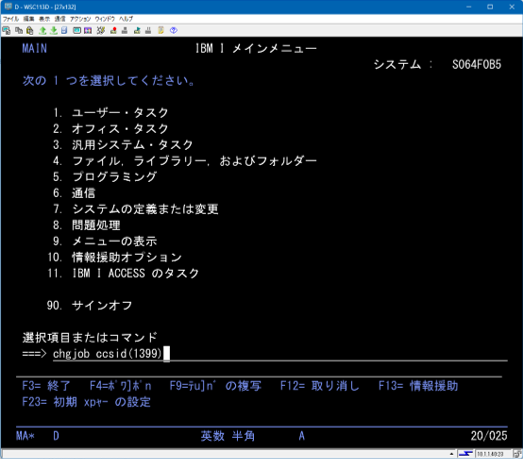 サインオン後、現行ジョブのCCSIDを1399に変更します。(CHGJOB CCSID(1399))