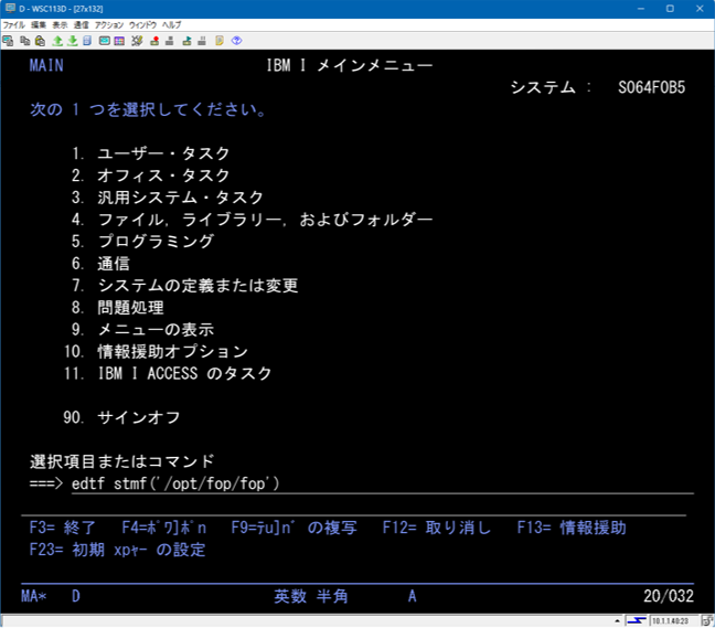 5250エミュレータでホスト・コードページを1399にしたセッションで実行します。サインオンはQPMGR以上の権限があるユーザーで行って下さい。※Pythonがインストールされている前提です。