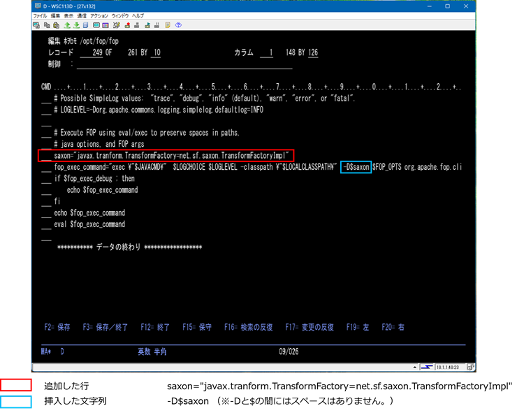 続いて、/opt/fop/fopシェル・スクリプトを修正し、Saxonを使用するように記述します。