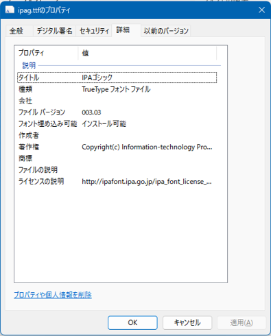Windowsで.ttfファイルのプロパティを表示し、「詳細」タブをクリックします。
