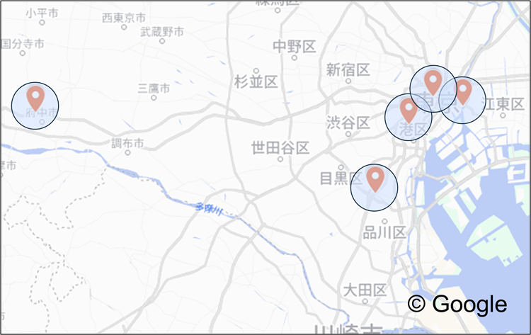 今回の例では、本社、箱崎、五反田、丸の内永楽といった各事業所の周辺に、複数のシェアサイクルポートが存在していることが分かります。