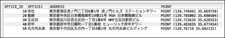 まずは、GEODATA.OFFICEというテーブルを作成し、IBM事業所の住所情報とあわせて、位置情報(経度・緯度)を格納できるようにします。