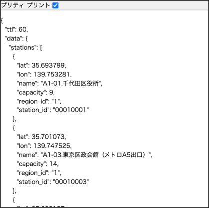右側のConsole画面で、全てのシェアサイクルポートの位置情報を取得します。