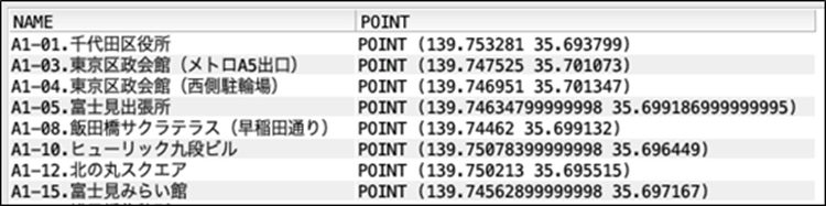 また、ST_AsText 関数を利用することで、LOCATIONカラムに格納された地理空間データを、POINT(経度 緯度)という人が読める形式で表示できます。