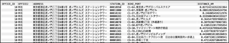 このクエリを実行することで、どの事業所の周辺に、どのシェアサイクルポートが存在するのかを一覧で確認できます。