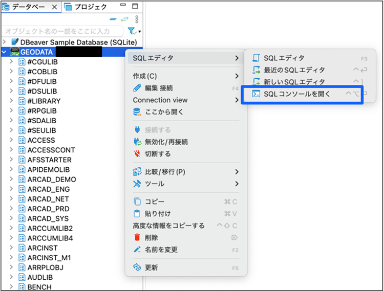 DBeaverで、IBM iのデータベースを選択し、接続後、SQLコンソールを開きます。