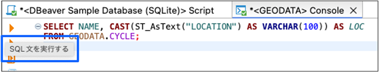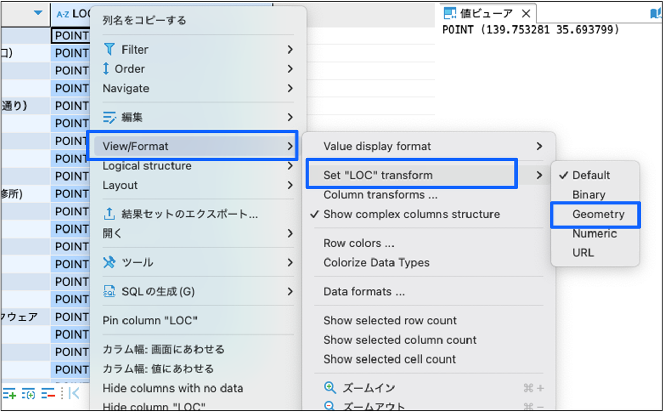 次に、実行結果がConsole の下にでてきます。結果の[LOC]列を右クリックして、[view/format]→[Set”LOC”transform]→[Geometry]の順に選択して、これで、LOC 列が地理空間データとして扱われるようになります。