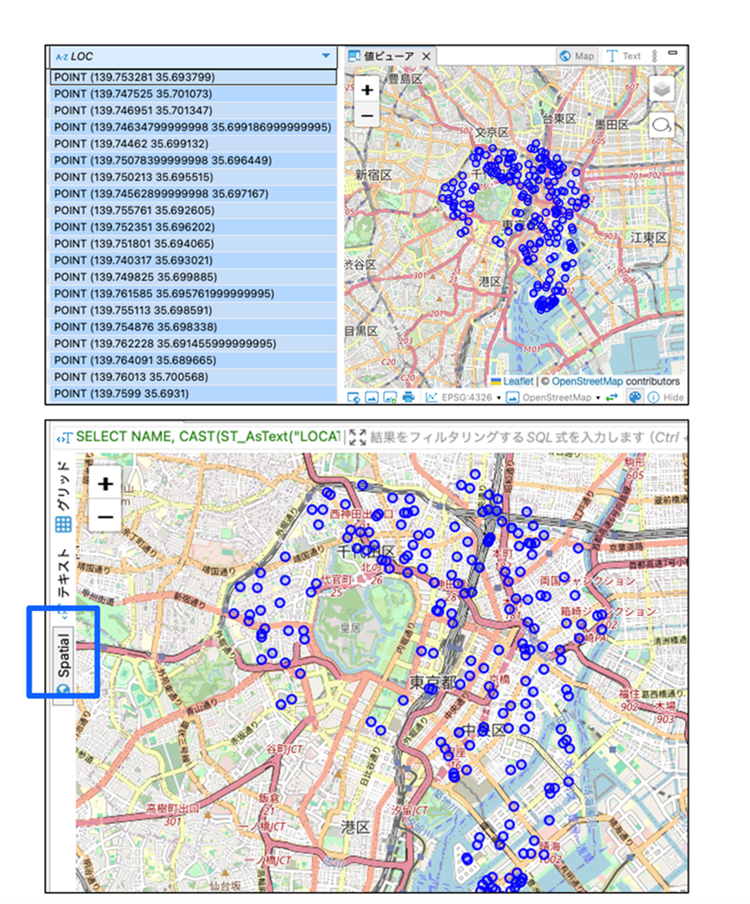 設定後、LOC 列のデータを全て選択し、「Spatial」ビューを開くことで、データを地図上にプロットできます。