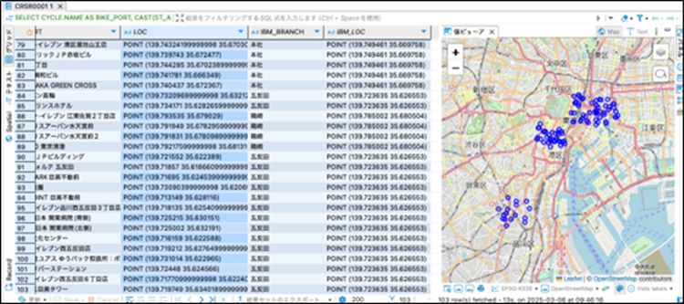 これまでの手順で、IBM i 上にはシェアサイクルポートの位置情報(経度・緯度)が地理空間データとして格納されています。このデータを地図上に表示することで、分布や位置関係を視覚的に把握することができます。