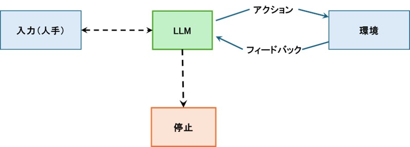 - LLMはフィードバックをもとに次のアクションを決定し、ループは継続